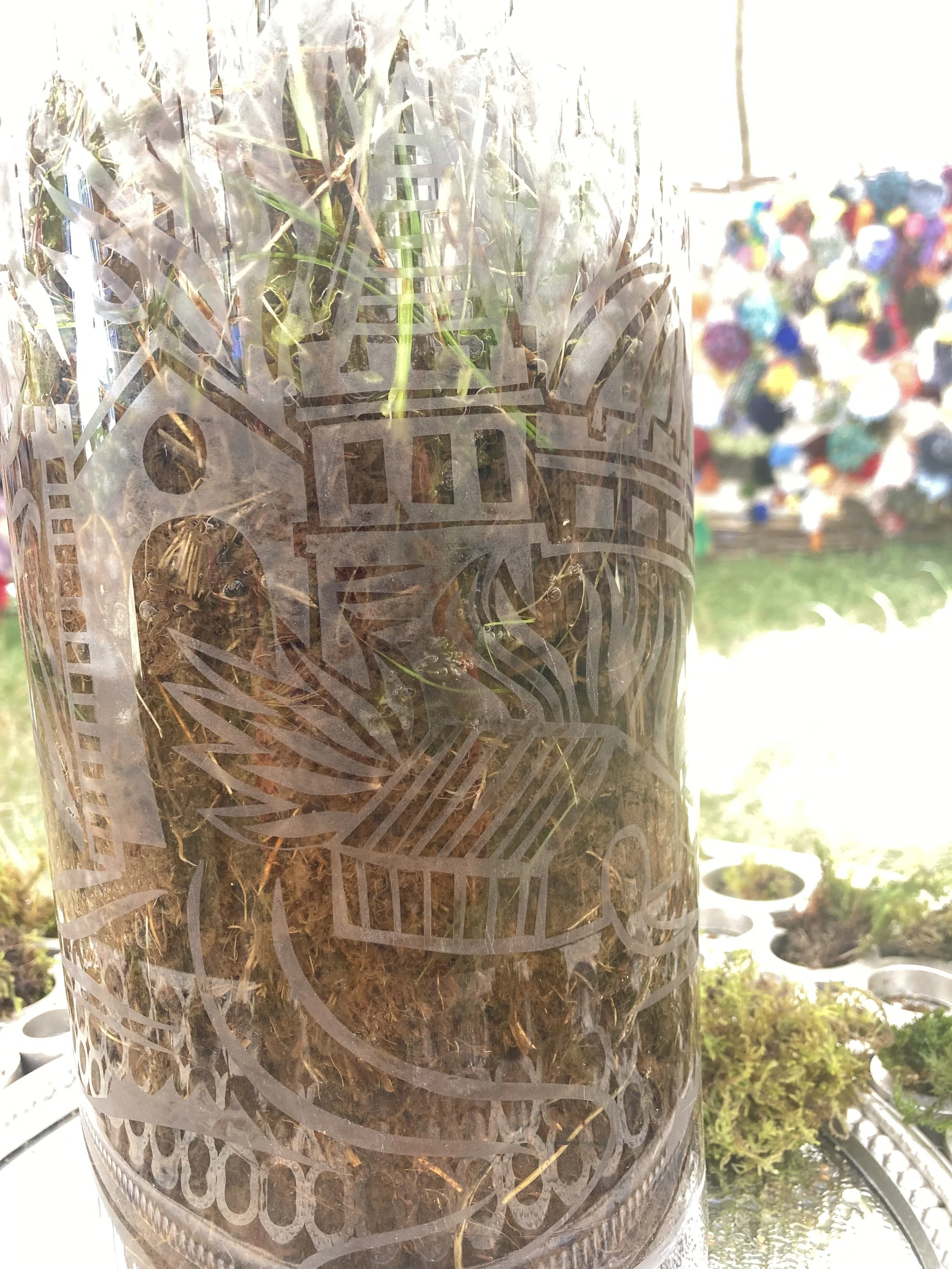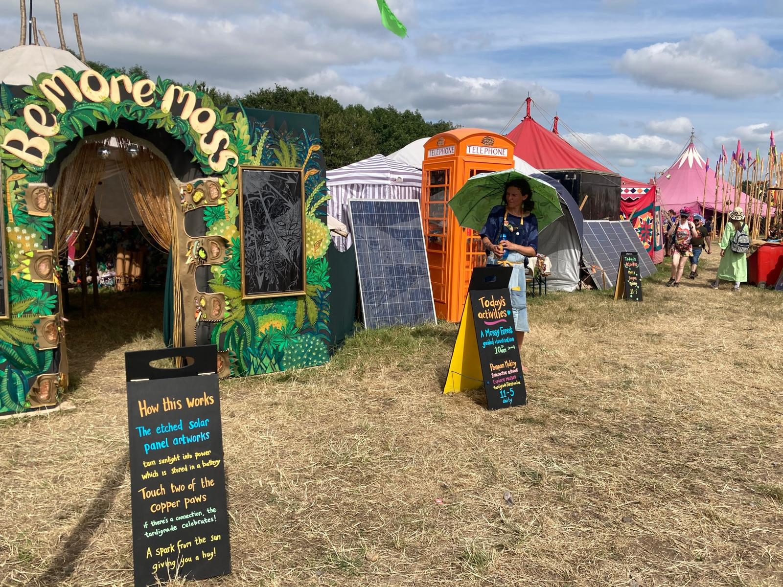 A Be More Moss portal welcomed everyone with solar artworks of moss. People touched and connected the paws of a tardigrade,(the most resilient creature on the planet) and lit their way through inside. It got people thinking about the role of the sun and resilience to our changing climate. Then came the invitation to touch and look closely through a hand lens to look at the star of the show - peat forming sphagnum moss (or pom pom moss as some call it!) in the centre of our roundhouse space.